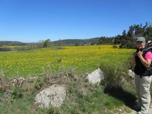 La route étant surélevée nous apercevons le Domaine du Sauvage dans le fond. Nous rencontrons Jean-Louis qui est allé déposé plus loin un pèlerin qui a mal au genou. Il est super ce Jean-Louis.