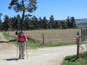 Au hameau, nous prenons la variante indiquée par Jean Louis. Cet ancien chemin sous bois est très agréable, nous suivons la ligne haute tension pour ne pas nous perdre et de toute façon, si les anciennes balises ont été effacées au niveau de la déviation, elles subsistent dans le sous-bois. A la sortie du bois, nous sommes près d’une grande plaine, nous passons un petit ruisseau et nous retrouvons la route. Nous marcherons sur le macadam pendant un moment.
