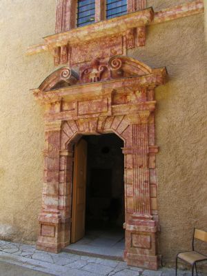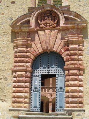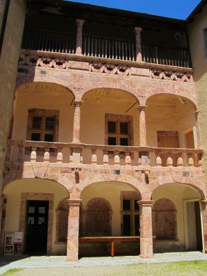 Nous arrivons au Château de St Alban qui est aussi l’Office du tourisme. Magnifique château avec trois galeries superposées et groupées autour d’une cour intérieure. La secrétaire de l’office de tourisme, installée dans une aile du château, nous invite à entrer par la cour intérieure pour visiter l’exposition sur St Jacques. Un mannequin est censé représenter un pèlerin mais fait plus penser à Dark Vador. Nous en profitons pour se faire tamponner notre créanciale.