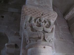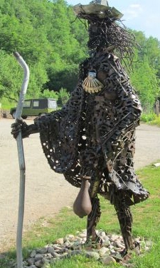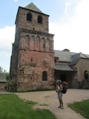 Nous prenons le chemin qui longe le Lot, il se prolonge sur la route pour rejoindre St Pierre de Bessuéjouls (335 m). Nous visitons l’église romane et la chapelle haute située au premier étage du clocher. Devant la mairie, trône une statue en fil de fer représentant un pèlerin. Après le village, le chemin grimpe fortement dans un petit bois jusqu’au plateau. Le sentier ensuite descend, il est très étroit et humide. Nous arrivons au hameau Le Briffoul, la chapelle est fermée.