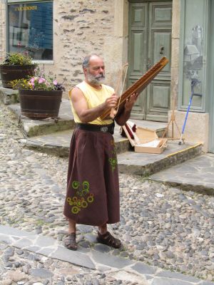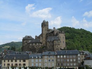 Après le pont, nous remontons sur la route goudronnée jusqu’au pont d’Estaing (320 m). Nous apercevons de loin le château d’Estaing. Nous passons le pont, près de l’église se trouve le château qui est en réfection et nous ne pouvons le visiter. Un petit tour dans les ruelles d’Estaing et comme il est l’heure de déjeuner, nous nous arrêtons au petit restaurant près de l’église où nous retrouvons Nicole la bretonne et d’autres pèlerins déjà rencontrés. Un musicien nous fait l’honneur de jouer de son instrument ancien qui ressemble fort à une viole.